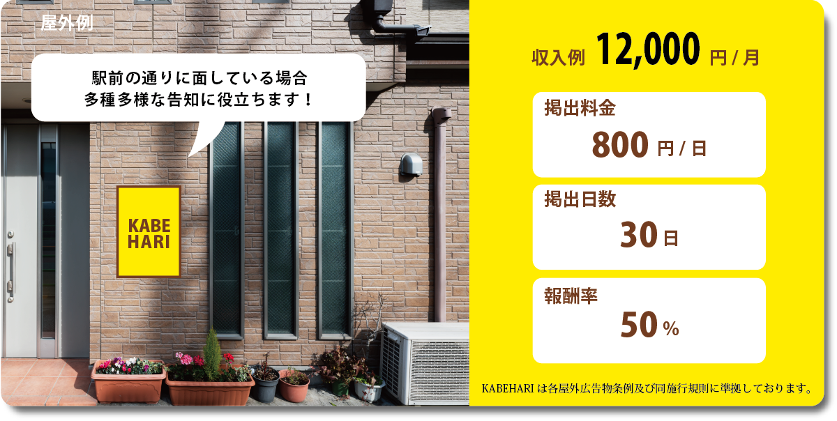 KABEHARIは、壁面を誰でも広告スペース(ポスター貼付場所)として貸し借りできる、 シェアリングサービスです。 個人宅や事業所などの物件所有者(オーナー)が、 ポスター貼付に壁面を利用したい方(ユーザー)に提供します。 KABEHARIが壁面の登録・掲載を行い、利用されるとKABEHARIからオーナーに報酬が支払われます。