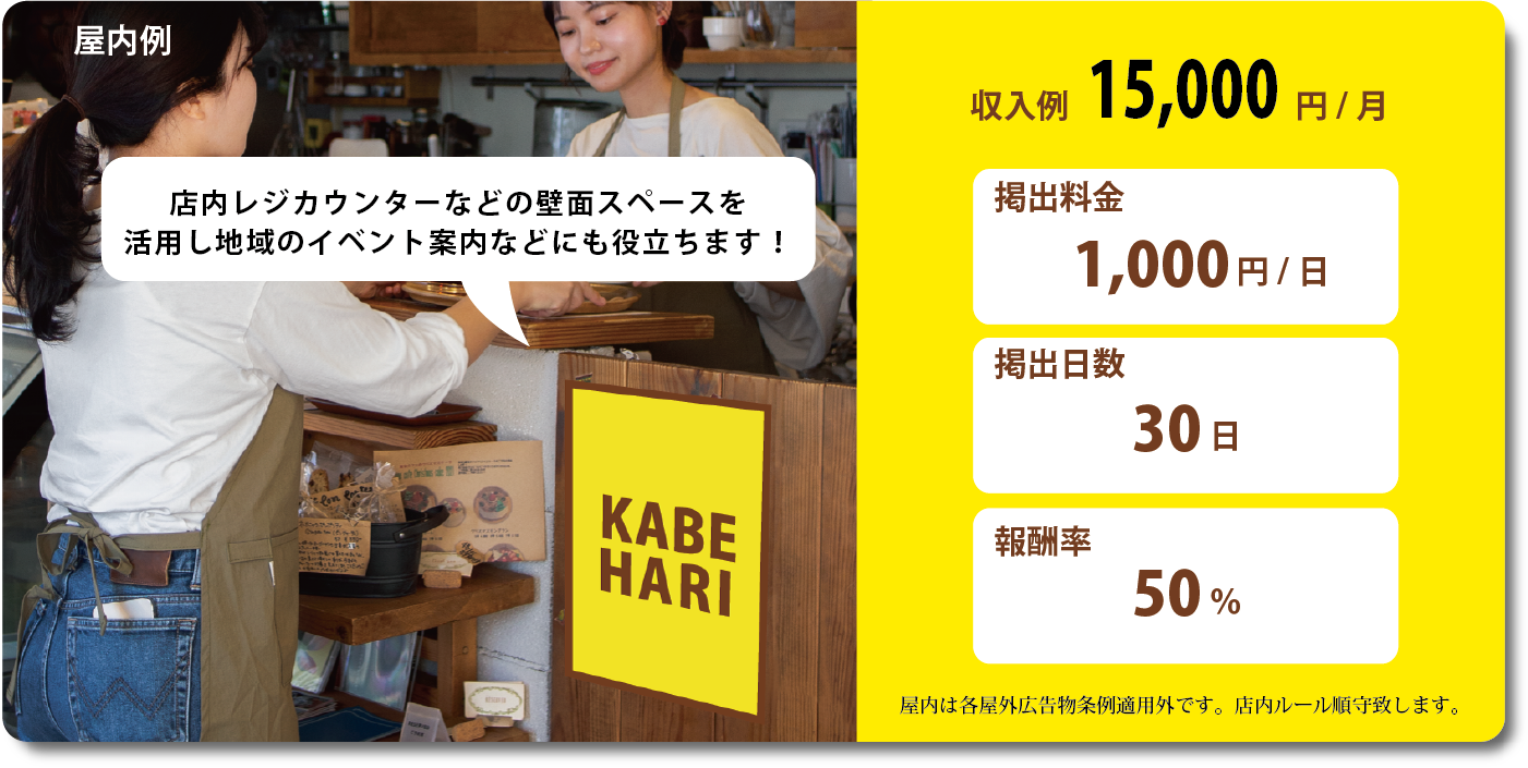 KABEHARIなら簡単に壁面スペースを収益化することができます。 もちろん、登録・MAP掲載料は無料で、設備も不要。
